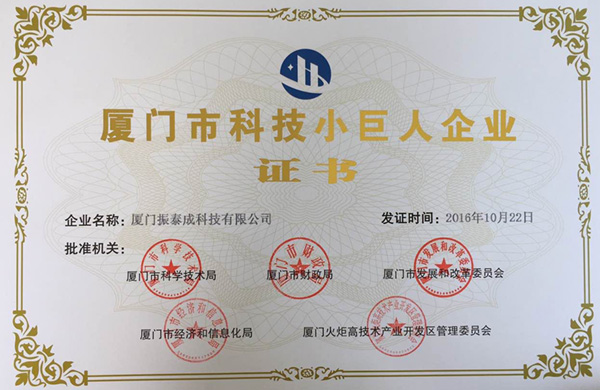 熱烈祝賀我公司廈門振泰成科技有限公司于2016年10月獲得獲得“廈門市科技小巨人”的榮譽(yù)證書(shū),謝謝廈門市科學(xué)技術(shù)局、廈門市財(cái)政局、廈門市經(jīng)濟(jì)和信息化局、廈門火炬高新技術(shù)產(chǎn)業(yè)開(kāi)發(fā)區(qū)管理委員會(huì)和廈門市發(fā)展和改革委員會(huì)對(duì)我司的高度肯定!